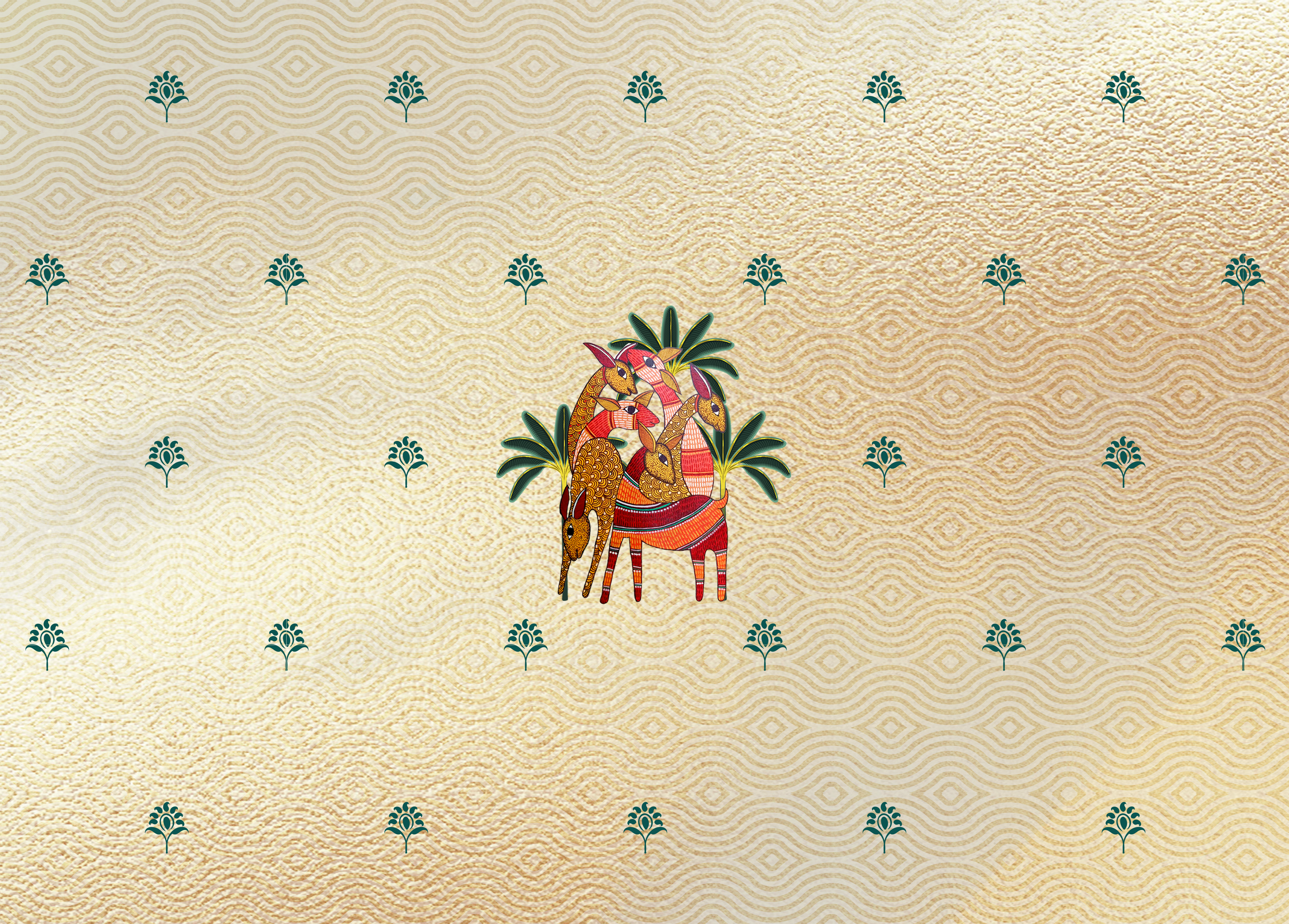 "The Deer Story" showcases Gondart deer figures with trees, set against a shimmering gold wavy background. This design seamlessly blends traditional artistry with modern elegance.