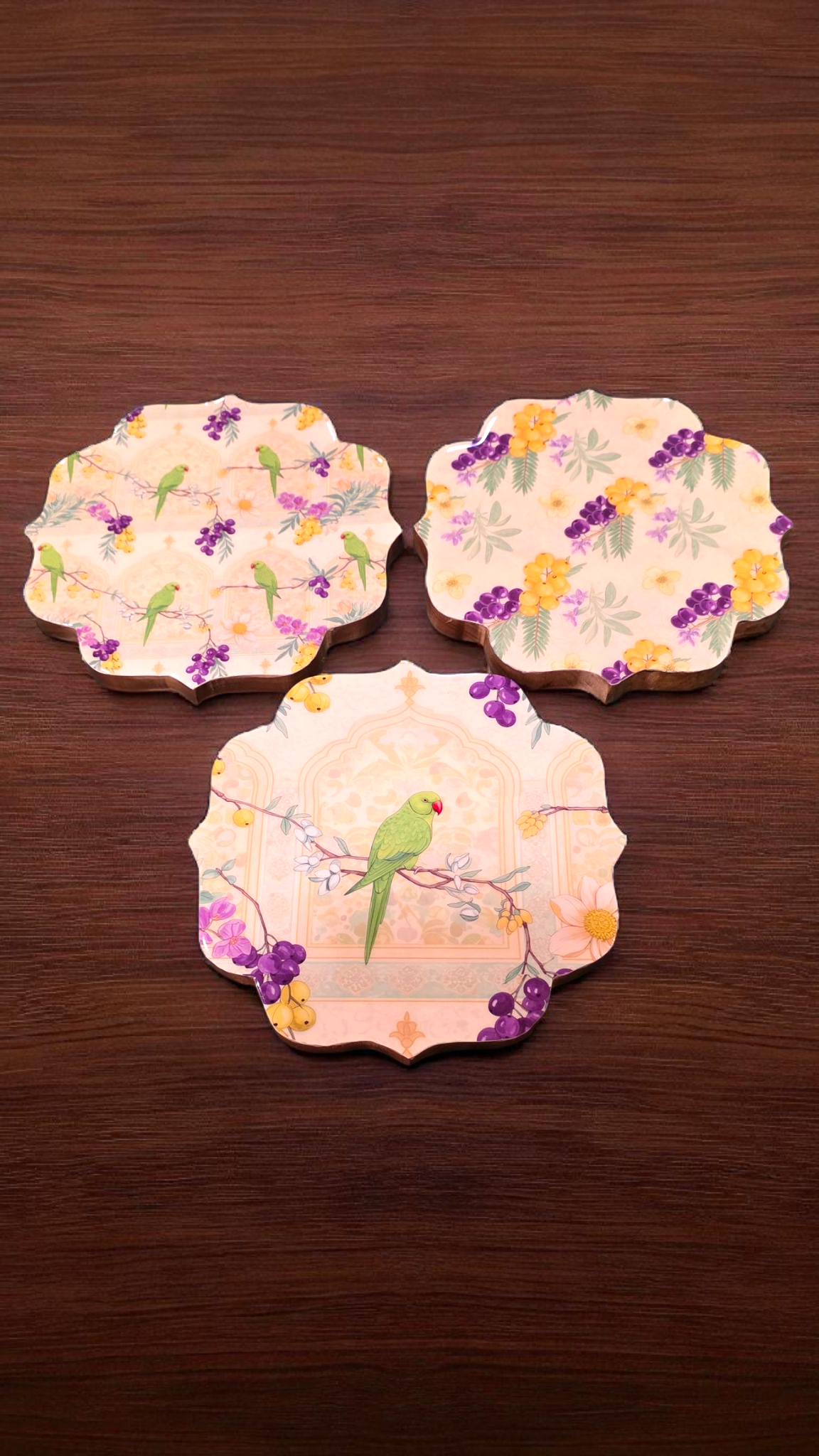 Indulge in the playful charm of our Set of 3 Indian Royal Shape Trivets, available in exquisite prints. Crafted with meticulous attention to detail, these trivets seamlessly blend elegance with modern functionality.